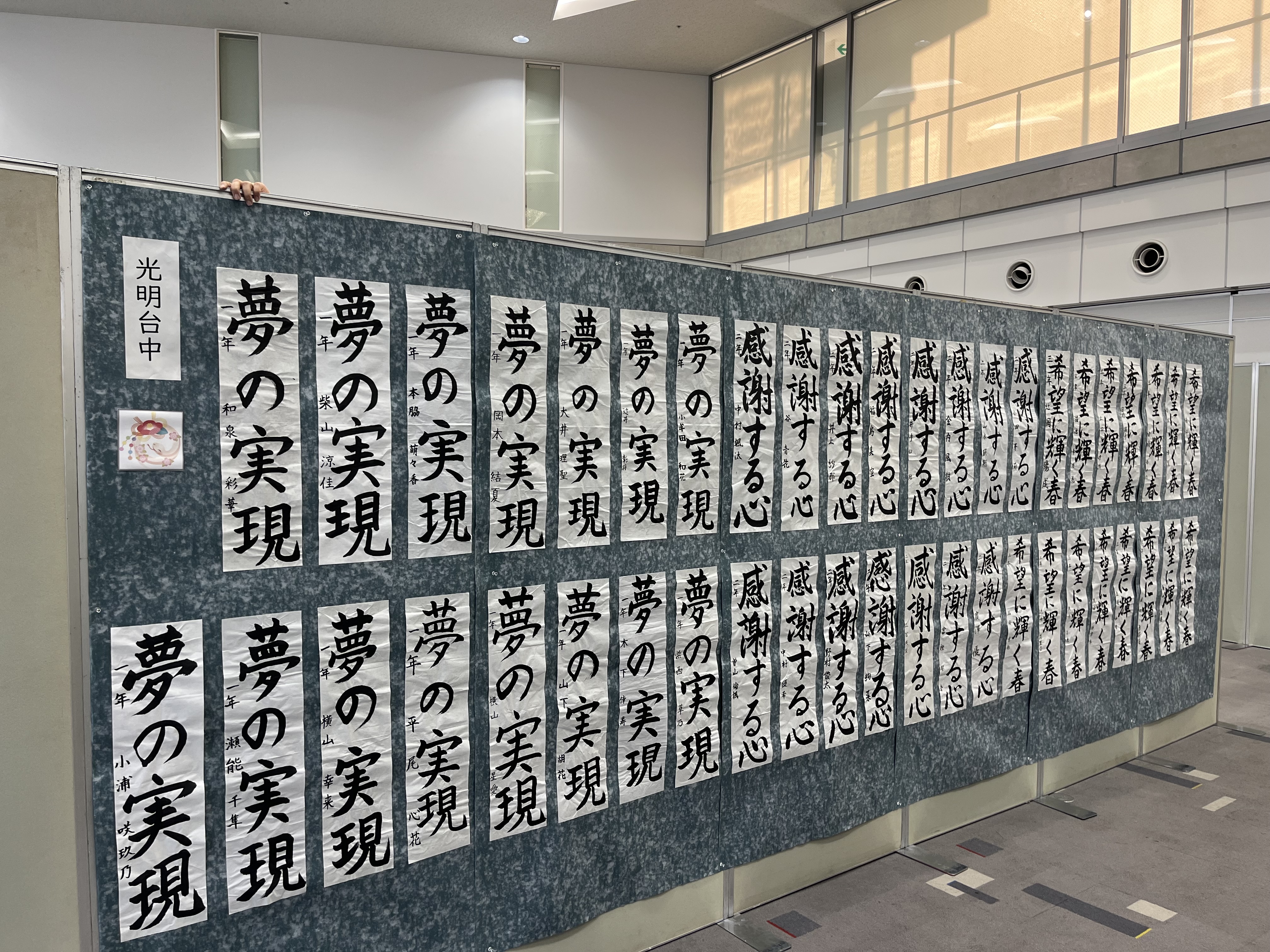 1月25日(土)と26日(日)の2日間、和泉市シティプラザ3階レセプションホールにて「和泉市小中合同書き初め展」が開催されました。1年生「夢の実現」2年生「感謝する心」3年生「希望に輝く春」という題で、それぞれ冬休みに練習し提出された作品の中から各学年15名を代表として選び、出品しました。